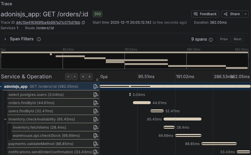 The package automatically instruments common libraries without any code changes. Out of the box, you get tracing for HTTP requests (incoming and outgoing), Lucid database queries (via Knex), Redis operations, and more.